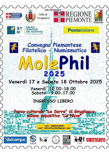Ritorna il convegno filatelico Molephil a Grugliasco (TO). La sede sarà nuovamente il salone espositivo "La Nave" all'interno del Parco Culturale "Le Serre". Noi saremo presenti sia venerdì 17 ottobre dalle ore 10.00 alle ore 18.00 sia sabato 18 ottobre dalle ore 9.00 alle ore 17.00. Speriamo di potervi incontrare di persona!